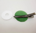 NinaBellaを使用したコサージュや髪飾りを製作する為のクリップです。NinaBellaを束ねたワイヤーをドーナツ形のパーツでしっかりと固定出来、クリップの本体内部にまとめたワイヤーが隠れるため、作品が美しく仕上がります。NinaBellaだけでなく、ワイクヤリングしたパーツを利用することも出来ます。クリップ本体が緑色のエクセーヌでカバーされていますので、優しい手触りとナチュラル感、オリジナル性を出しています。